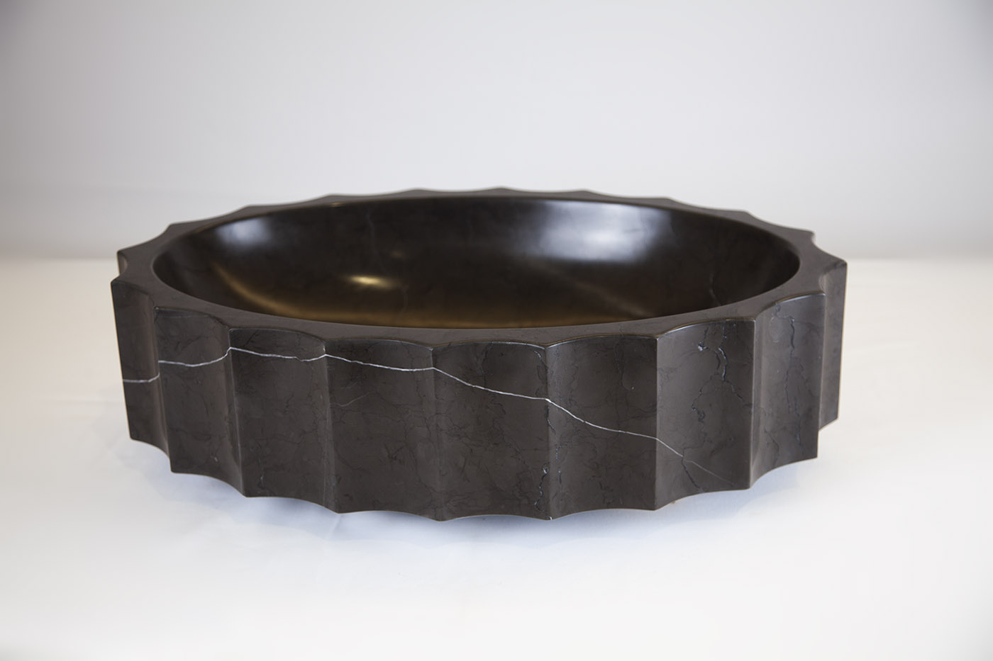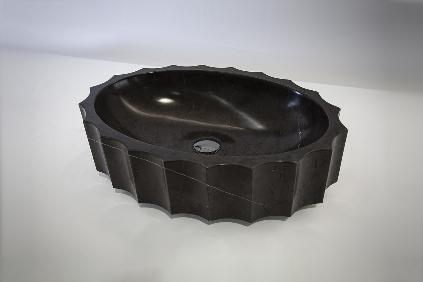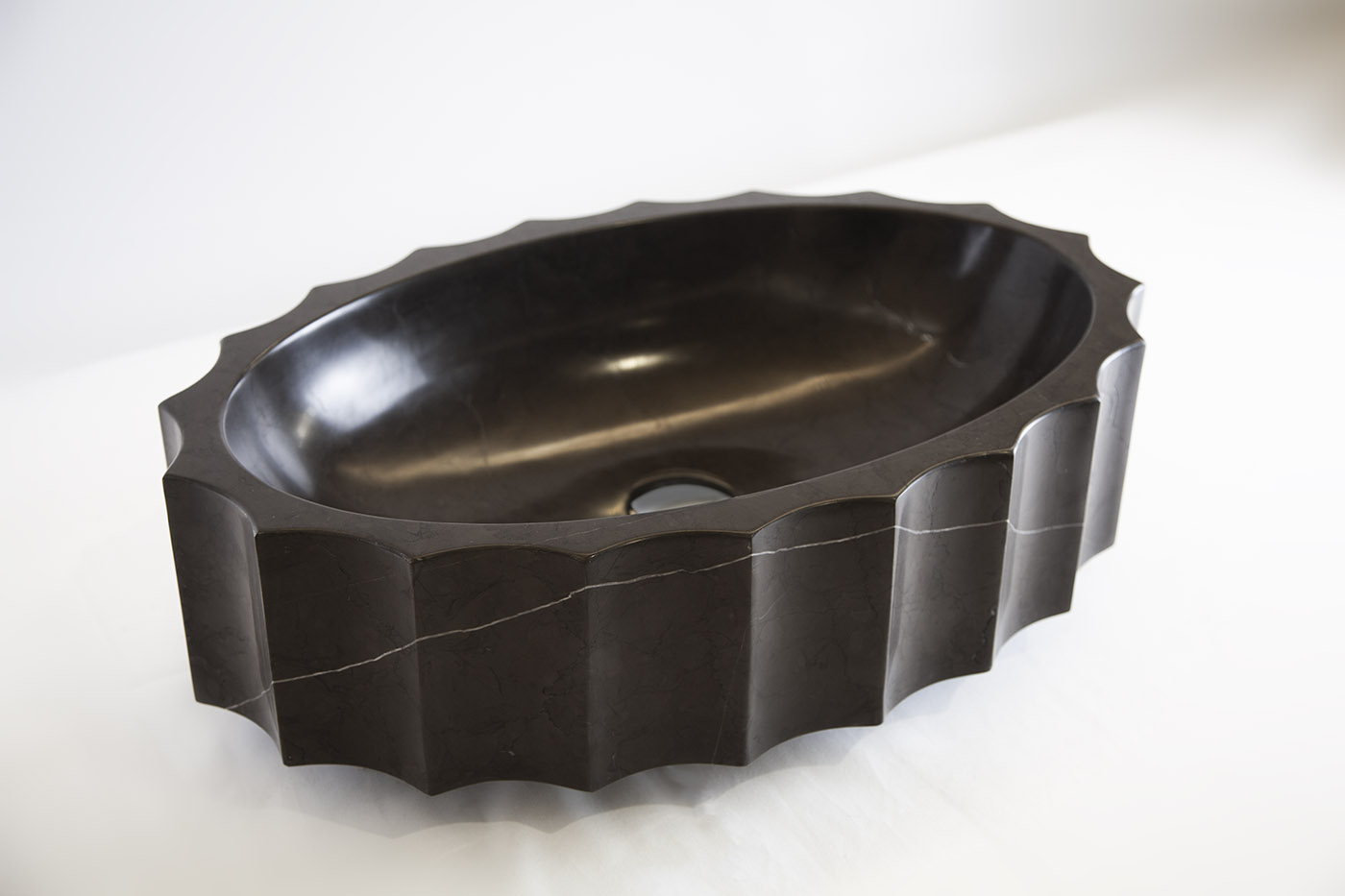 AXUR è un frammento di storia, un oggetto dalla chiara forza evocatrice in cui la materia lapidea ne fissa l’immagine ed il carattere scultoreo. Il lavabo di forma ellittica è definito plasticamente da una sequenza di scanalature che modulano la superficie laterale alternando la variazione chiaroscurale delle ombre in una sequenza sempre variabile. La versione d’appoggio sopra-piano individua la tipologia standard per un lavabo che si integra con un mobile da bagno su progetto o di produzione industriale. Nella trasposizione freestanding lo stesso “modulo” si ricompone con altri due elementi lapidei in un blocco unico, rafforzando così la sua autonomia formale e funzionale, e portando a compimento quel rapporto quotidiano con l’acqua, che si eleva a rito originario.